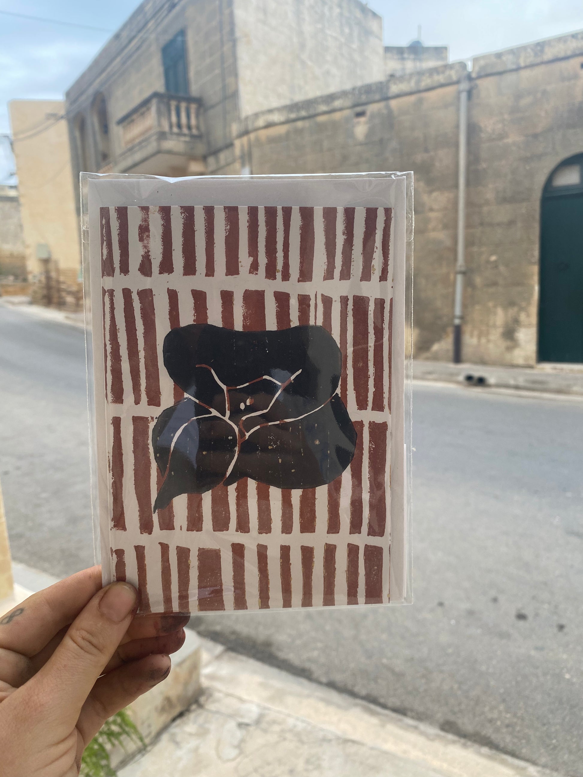 Each card is hand-printed using red ochre and black ink, honouring the goddess figurines discovered in the seven megalithic temples across Malta and Gozo - symbols of female strength, protection, and divine connection to the earth.