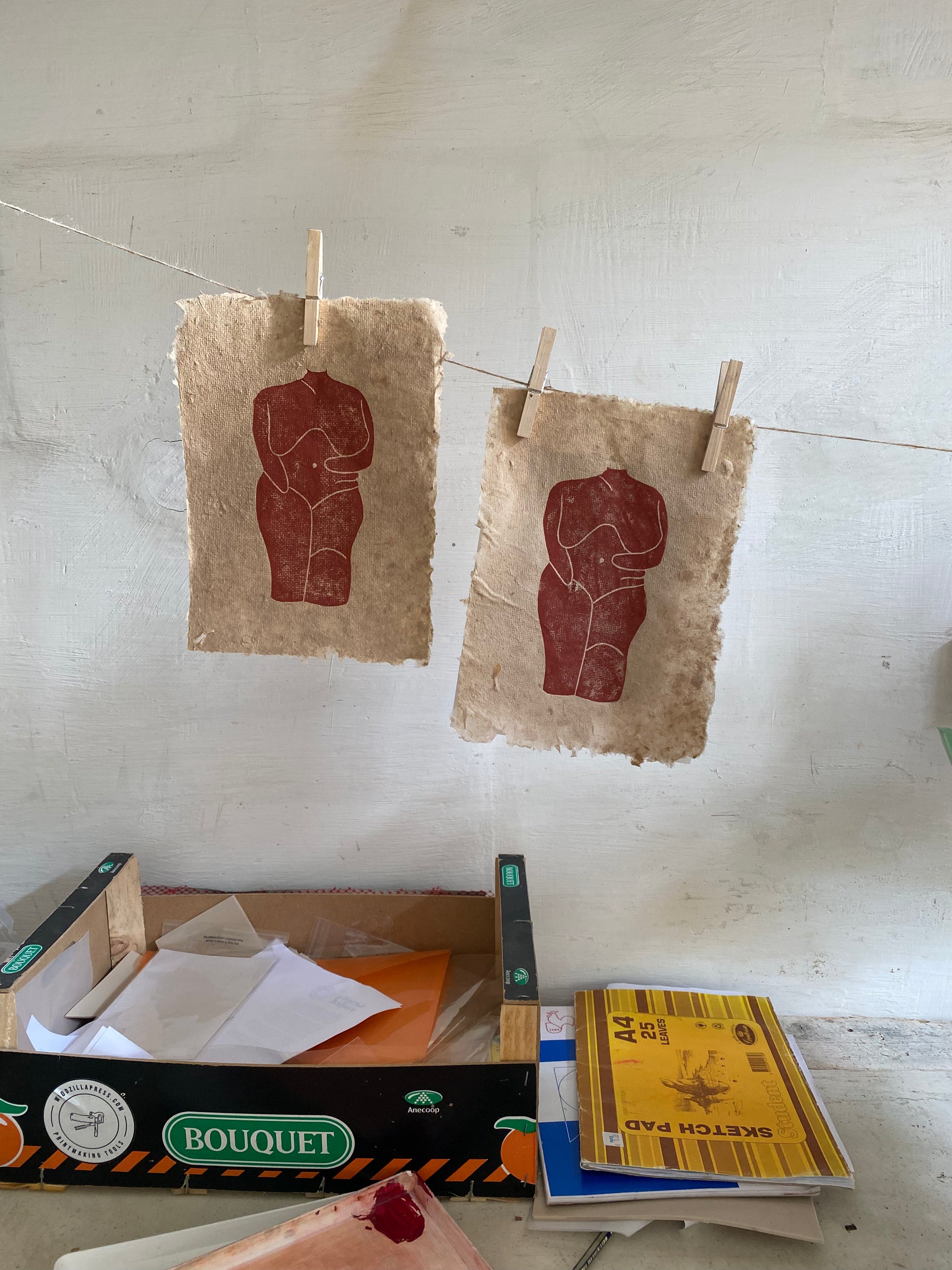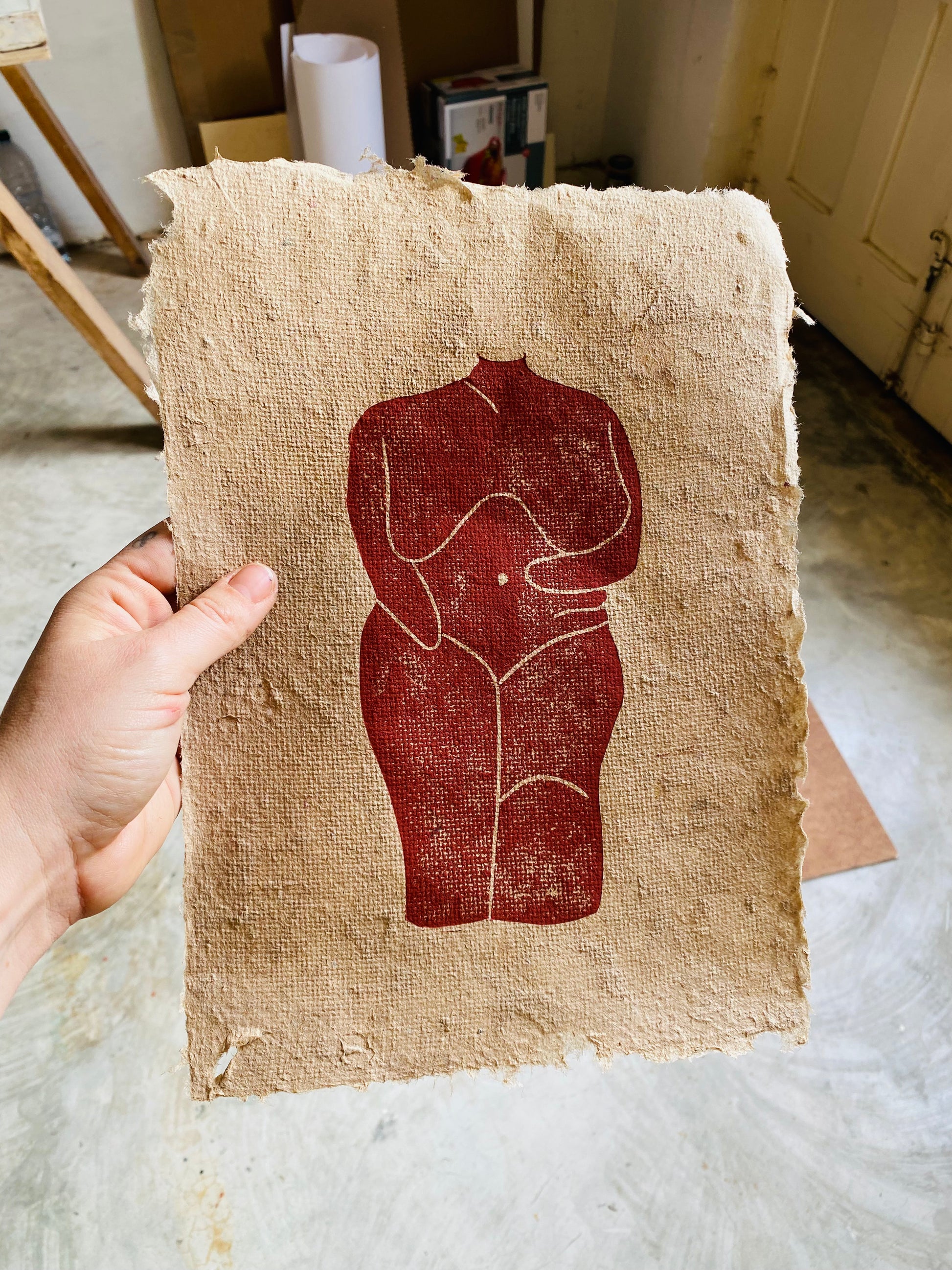 Printed in deep red ochre on handmade, brown recycled paper (crafted by the artist), each print is a one-of-a-kind embodiment of ancestral wisdom and resilience. The Goddess of Venus represents fertility, protection, and the divine force of womanhood once revered and now reclaimed.